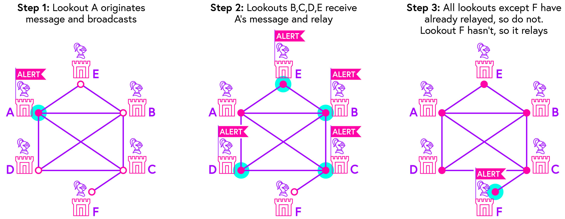 To make this less abstract (and fun), let us take an analogy. Imagine a scenario in medieval England where a “lookout network” covering the population of a county is built up to warn people of Viking raiders across the North Sea. The first sighter shouts “Northmen Alert” (or some equivalent “bird call” to obfuscate from the enemy!) and this needs to be relayed by the network of lookouts to reach everyone in the county. Further, each lookout may itself originate a message periodically to give an update of activity in their area. What is the algorithm each lookout should execute to get this done efficiently, i.e., use a minimum number of “shouts”? For the moment, let us not worry about message loss.