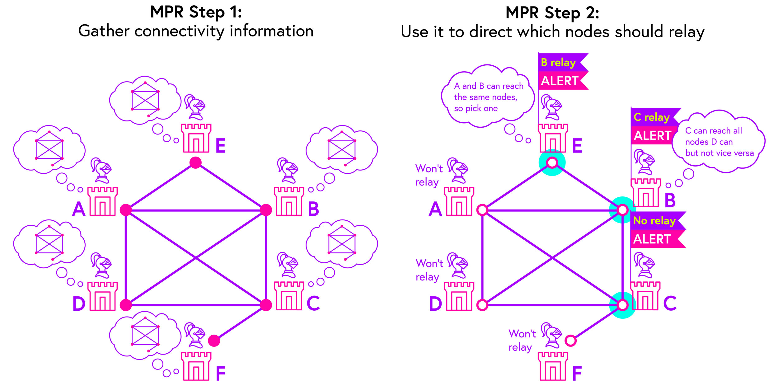Given that it doesn’t seem too hard to figure out critical relays if we know the connectivity network of the lookouts, one approach to the problem might be to first acquire the necessary network connectivity map at each node. This is the approach adopted by a protocol known as Multi-Point Relay (MPR) — developed to disseminate link-state information in OLSR, and perhaps the best known non-flooding choice. MPR figures out which subset of its 1-hop neighbors reaches the maximum number of 2-hop neighbors, breaking ties randomly. It then selects a subset of 1-hop neighbors as critical relays and instructs them to relay. The figure below illustrates the key idea.