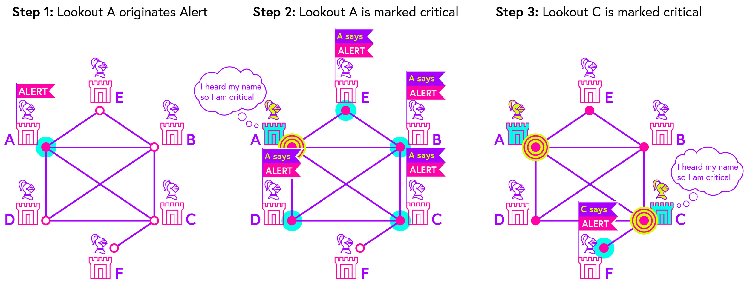 Let us execute the above decentralized rules on each lookout in our network (see Figure). In Step 1, A simply transmits ALERT since he is the originator. In Step 2, since B, C, D and E all first heard the Alert from A, they all transmit “A says Alert”. All lookouts except F hear each others’ shouts, but only A has heard his name being mentioned. Thus, by the rule mentioned earlier, only A marks himself critical in Step 2.