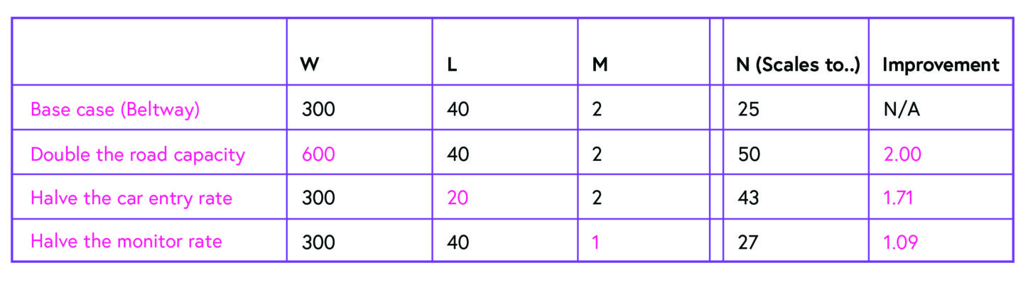 But suppose we consider a circular road whose capacity is an order of magnitude (10x) less than the Beltway, say like the Kathmandu Ring Road in Nepal, but with the same assumptions, including monitors. It can obviously not carry the same level of traffic as the Beltway, but what if the traffic load is also reduced by an order of magnitude? Then, it is reasonable to expect that the scalability remains about the same since both are cut by the same amount. Is this true?