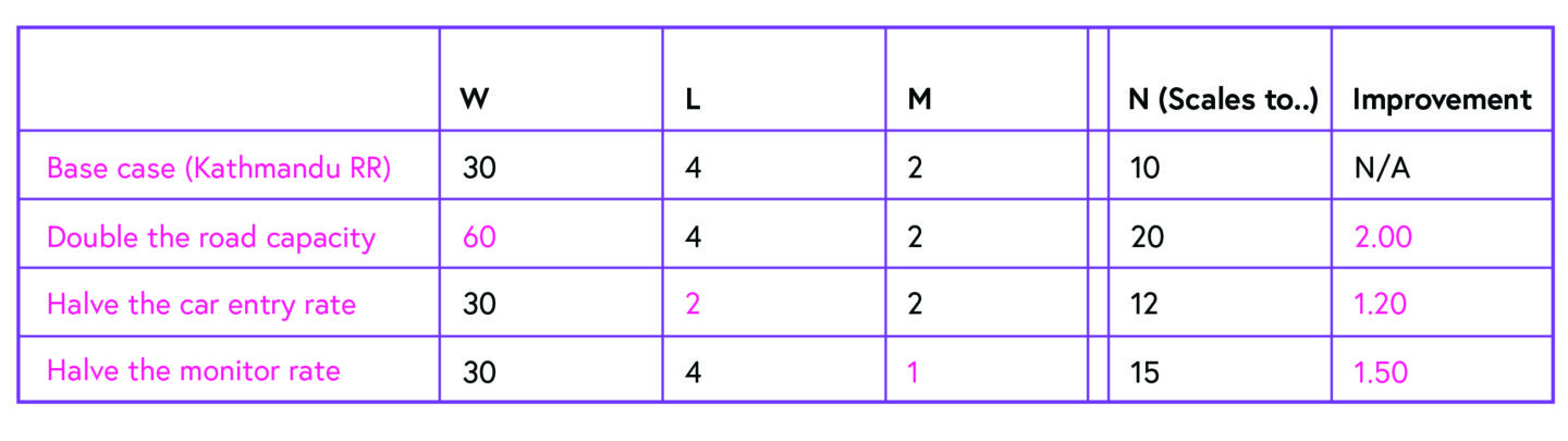 Clearly, the reason for the above situation is that the monitor cars weren’t trimmed down in proportion to the actual traffic. To do so is not straightforward since monitoring needs don’t necessarily reduce with capacity. But first, does trimming overhead even help — after all, we say that it only gave us a 9% lift in the 10-lane case. But re-doing the impact analysis with the new base case of a lower-capacity lower-traffic Kathmandu Ring Road shows that it does now give a 50% improvement - so well worth doing!