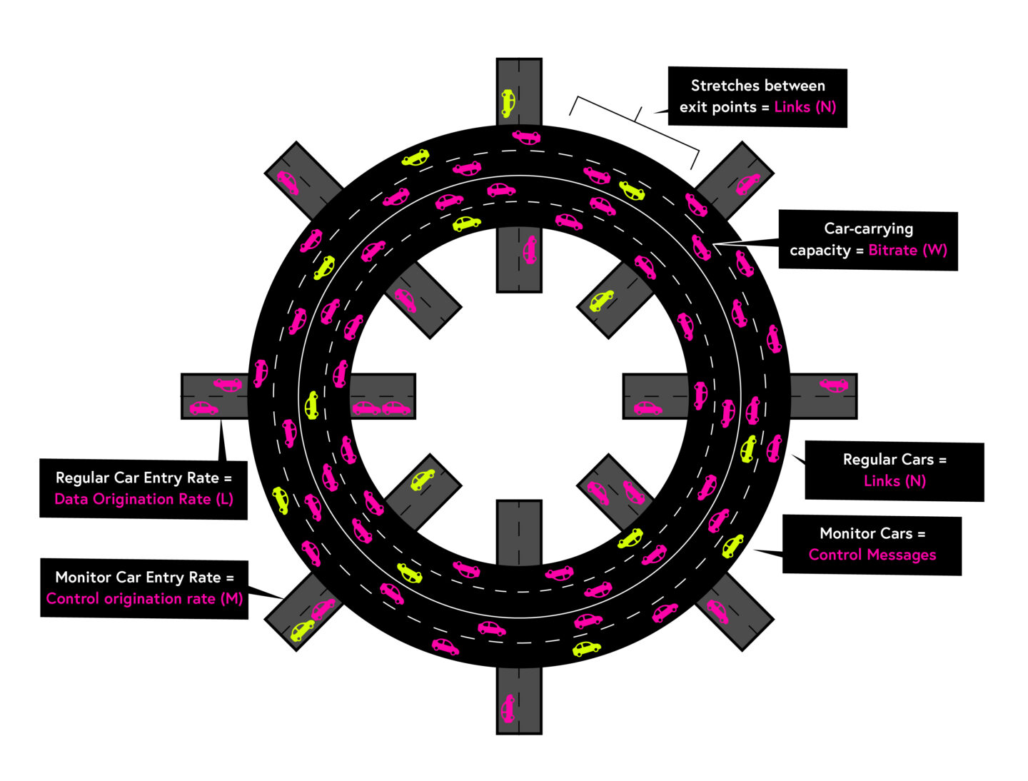 Our version of the Beltway is shown in the figure below. It has N equally spaced entry/exit points, and can carry W cars per minute on each stretch between entry/exits. Cars enter the highway at a certain rate L per minute from each entry ramp. The circular Beltway is analogous to a type of network called a ring network: exits are nodes arranged in the form of a ring, the stretches of highway between exits are the links between adjacent nodes, lanes are channels, and cars are messages.