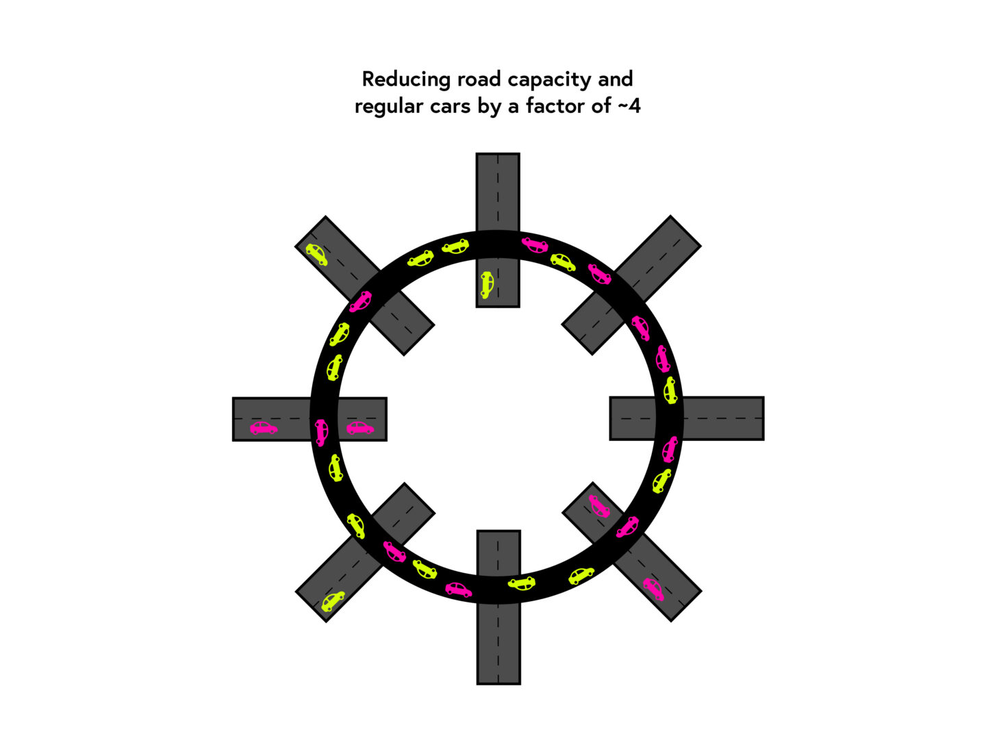 A less extreme case of this issue is illustrated in the figure, where both the number of lanes and regular cars are cut down by 4x, but the number of monitors is the same. Notice how more than half of the capacity is occupied by monitors — reducing by 10x would make it even worse.
