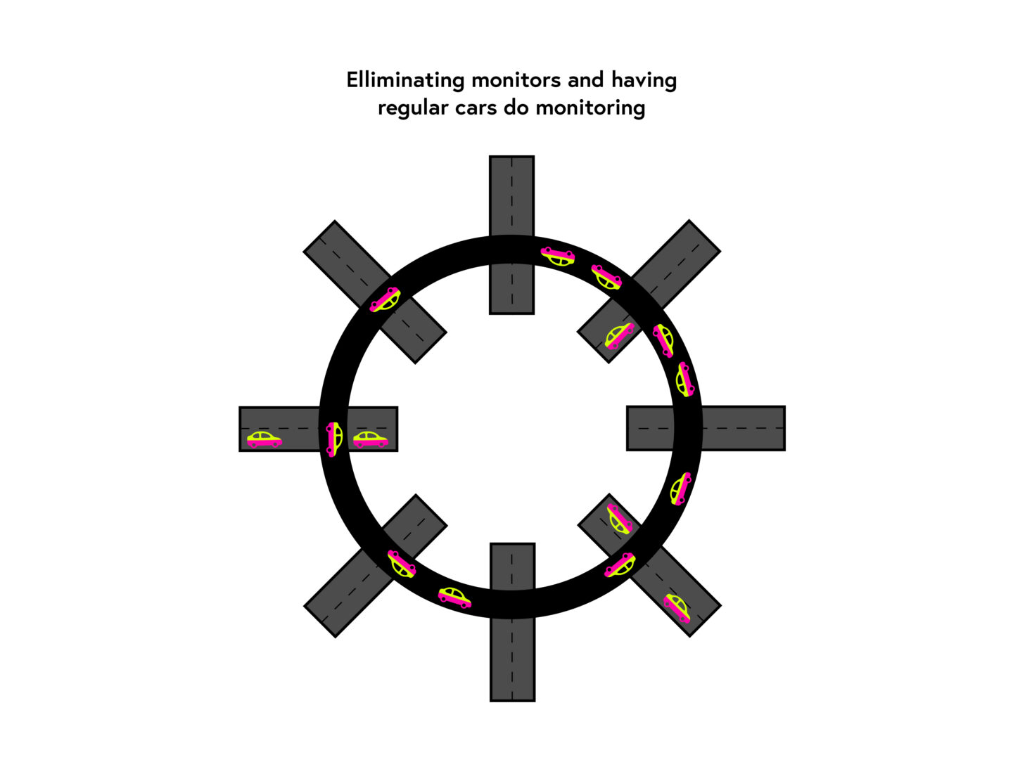 There are many ways to monitor traffic and accidents, but let us suppose that this is being done using special vehicles run by the transportation authority — we call them monitors. In the figure below, regular cars are shown in red, and the monitors in yellow. We assume there are M monitors per minute injected into the Beltway at each entry point that go all the way around the Beltway before exiting (more on this overkill later).